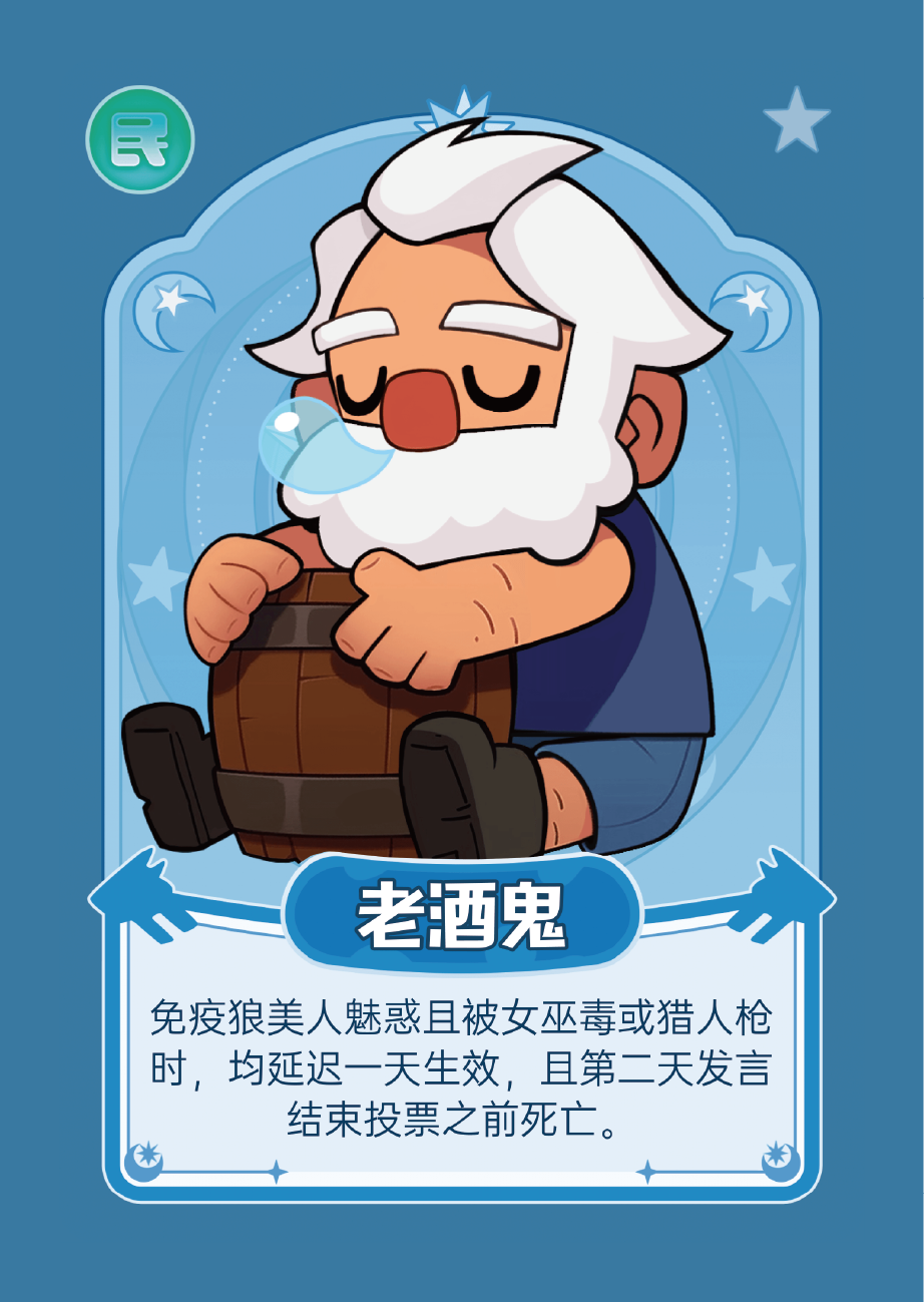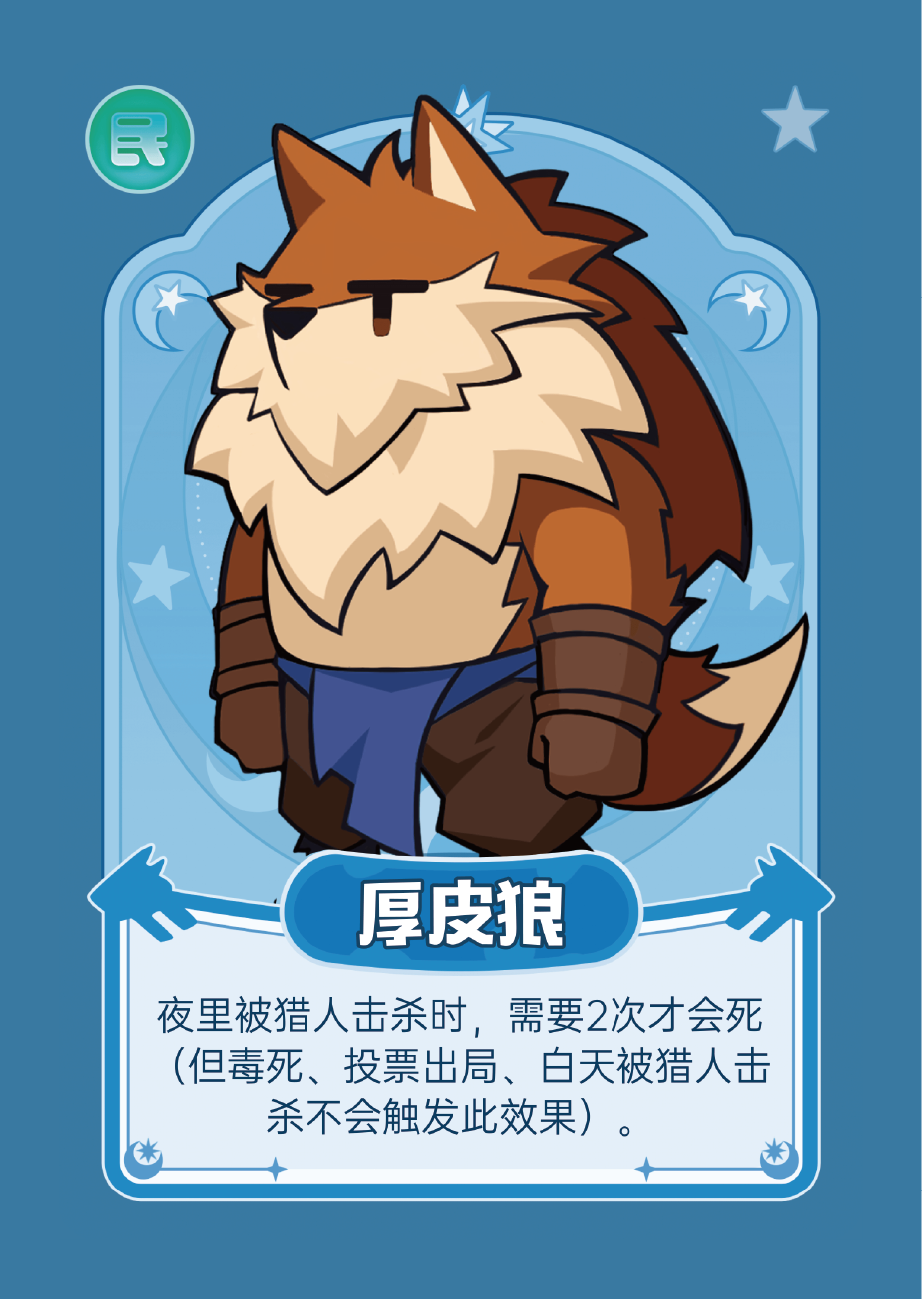 技能:夜里被猎人击杀时,要多杀一次才能杀死(被毒杀、投票出局、白天被猎人开枪击杀情况除外)。