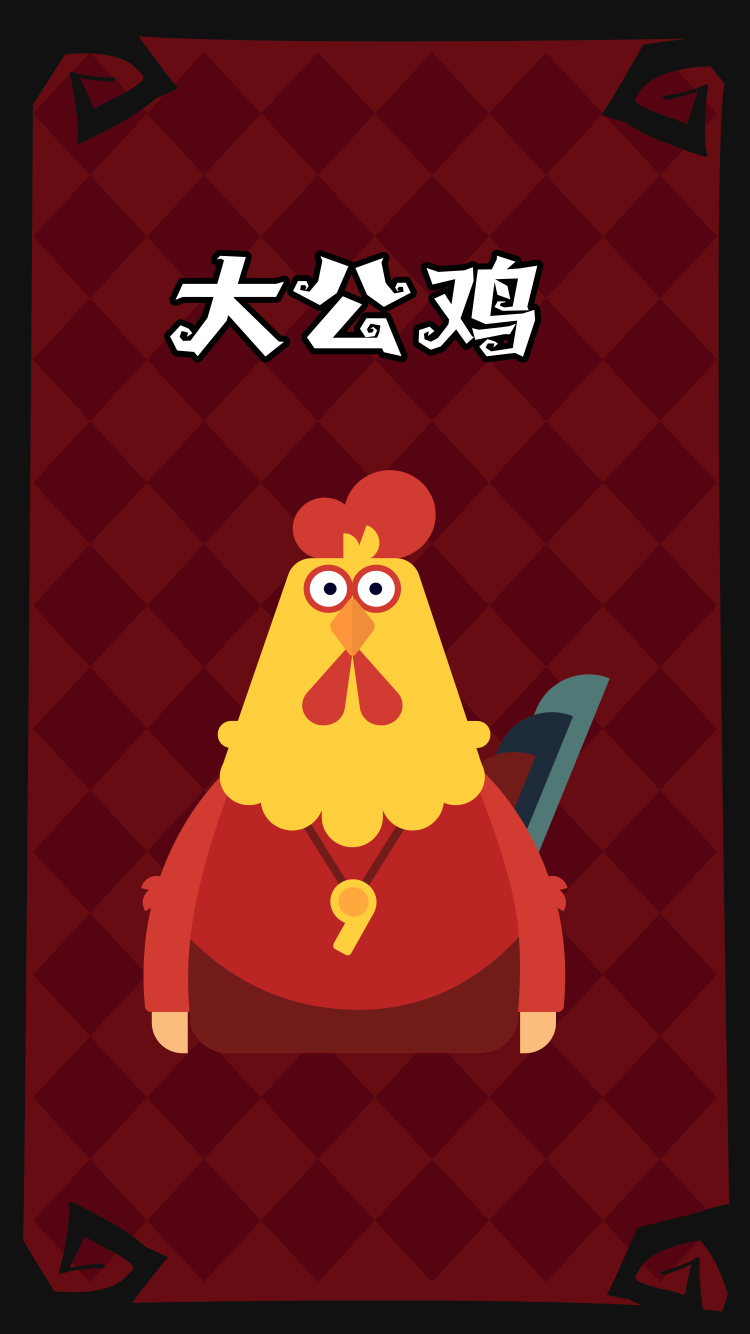 技能:大公鸡夜里如果被狼人杀死,第二天无法叫醒大家,将跳过一个白天,直接进入黑夜。
