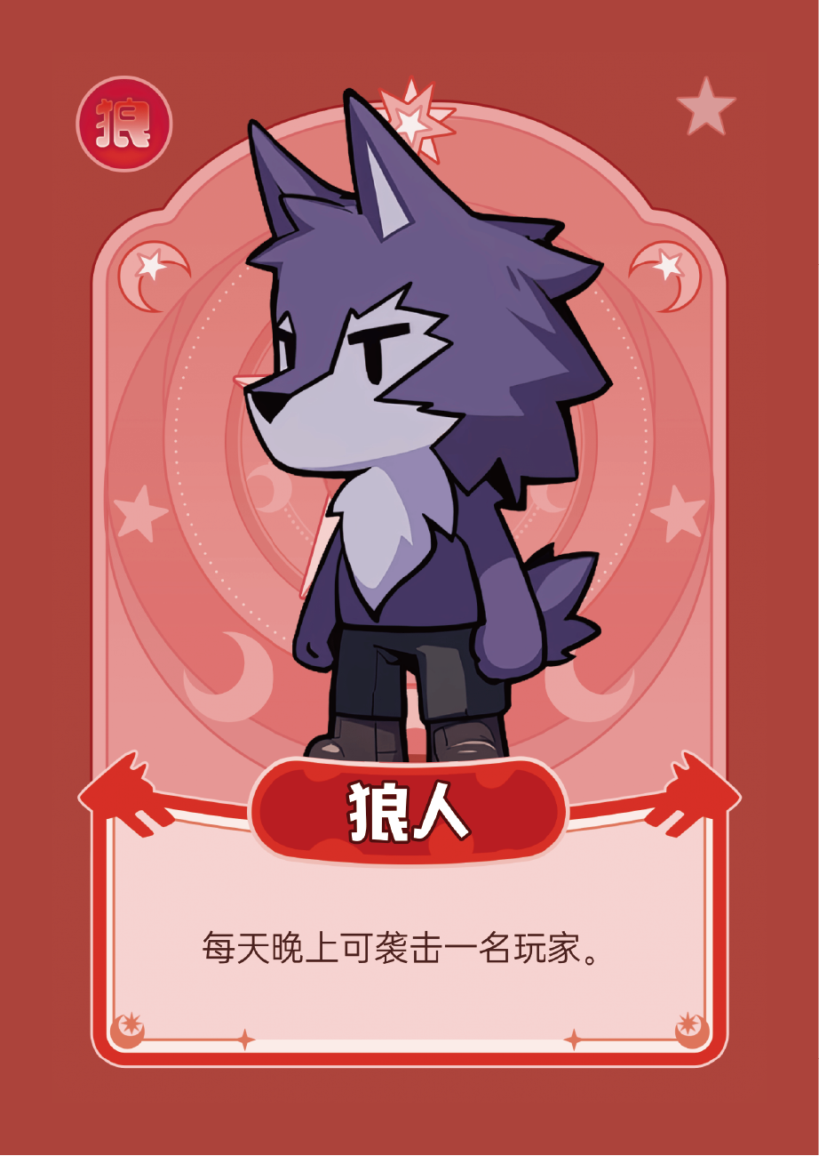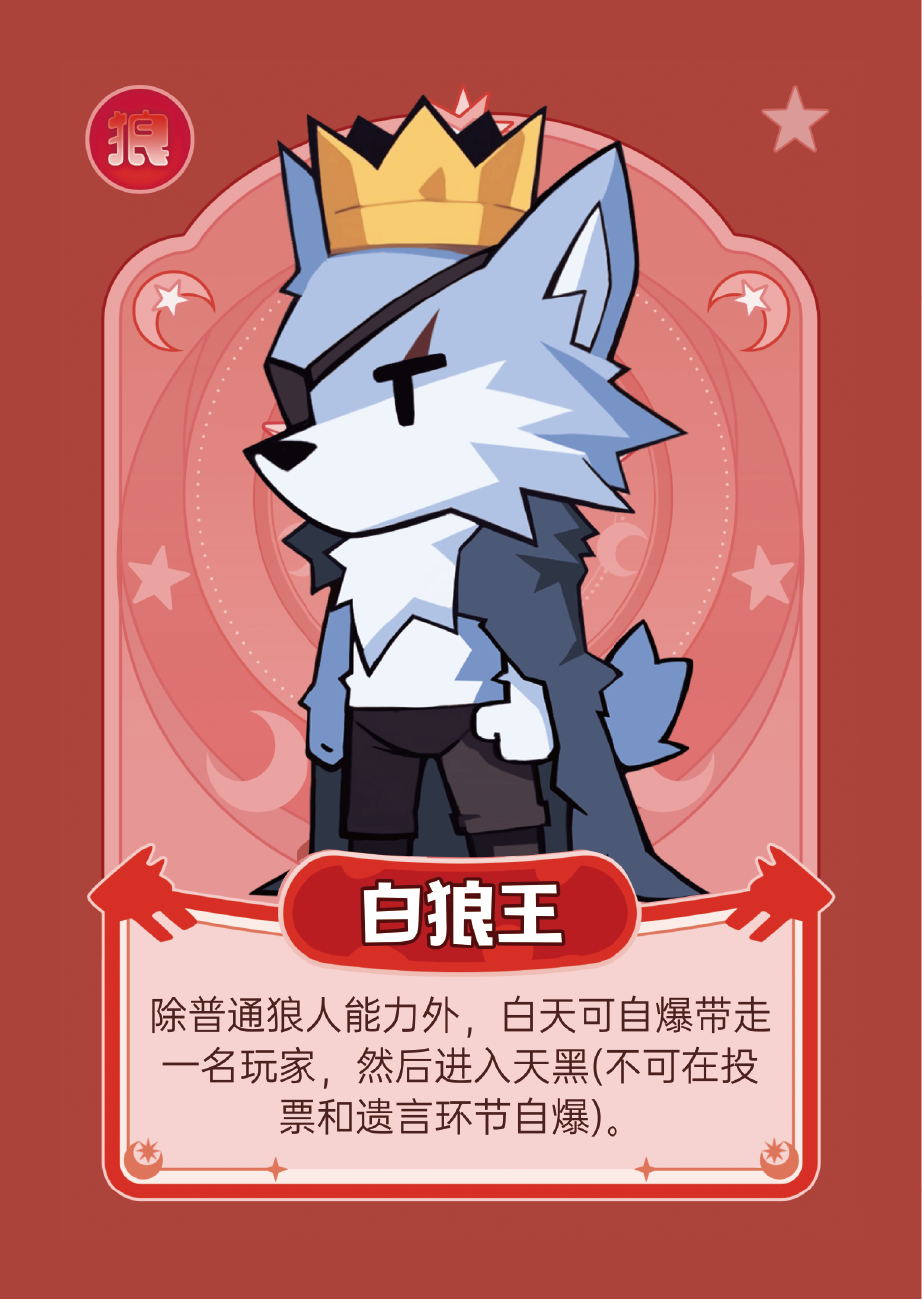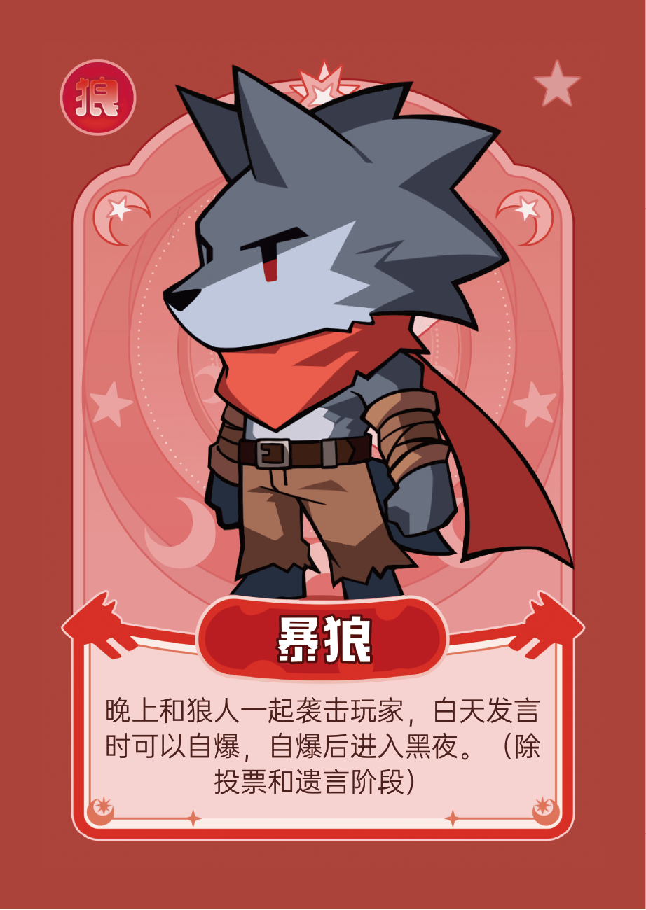 技能:除普通狼人能力外,白天可自爆带走一名玩家,然后进入天黑(不可在投票和遗言环节自爆)。