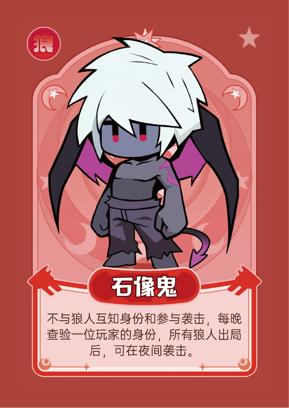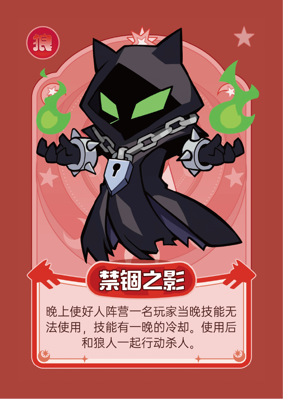 技能:晚上可禁锢好人阵营一名玩家,使其当晚技能无法使用,使用一次后,需要隔天才能继续使用。使用技能后,和狼人一起行动杀人。