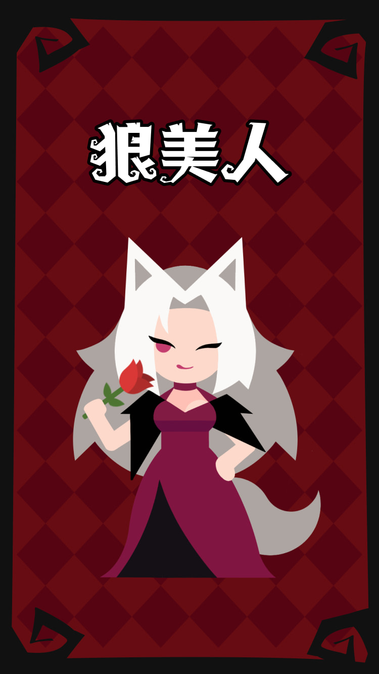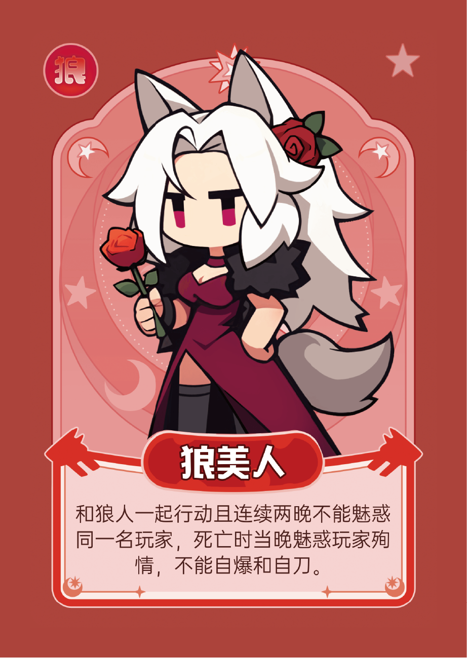 技能:除狼人能力外,每晚可以魅惑一名玩家,当狼美人死亡时,当晚被魅惑玩家随之殉情,狼美人不能自爆或者自刀,不能连续两晚魅惑同一名玩家。