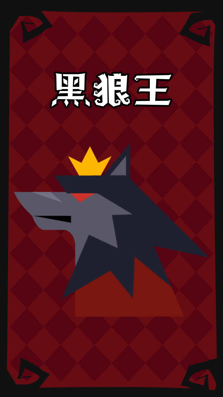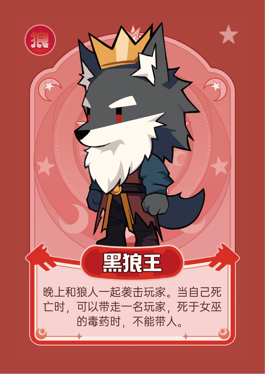 技能:晚上和狼人一起杀死一名玩家。当狼王死亡时,可以带走一名玩家,死于女巫的毒药时,不能带人。