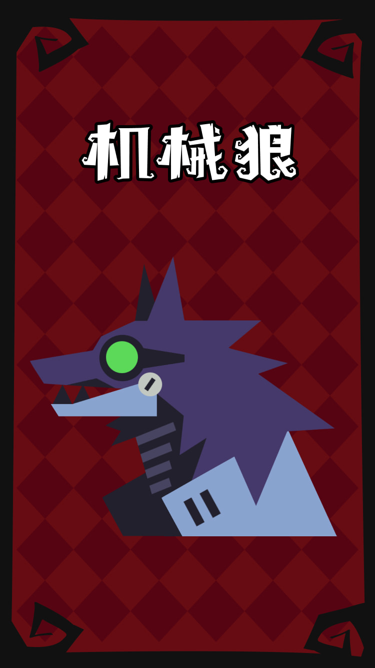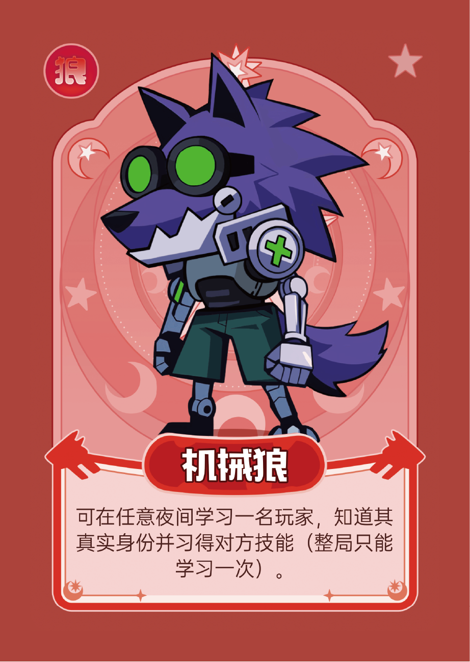 技能:机械狼可在任意夜间学习一名玩家,知道其真实身份并习得对方技能,直至游戏结束(只能学习一次)。机械狼夜间单独行为,与其他狼人互相不知道对方身份,有任一其他狼人存活时,机械狼都不参与狼刀,当其他狼人全部死亡后,机械狼才能获得狼刀。