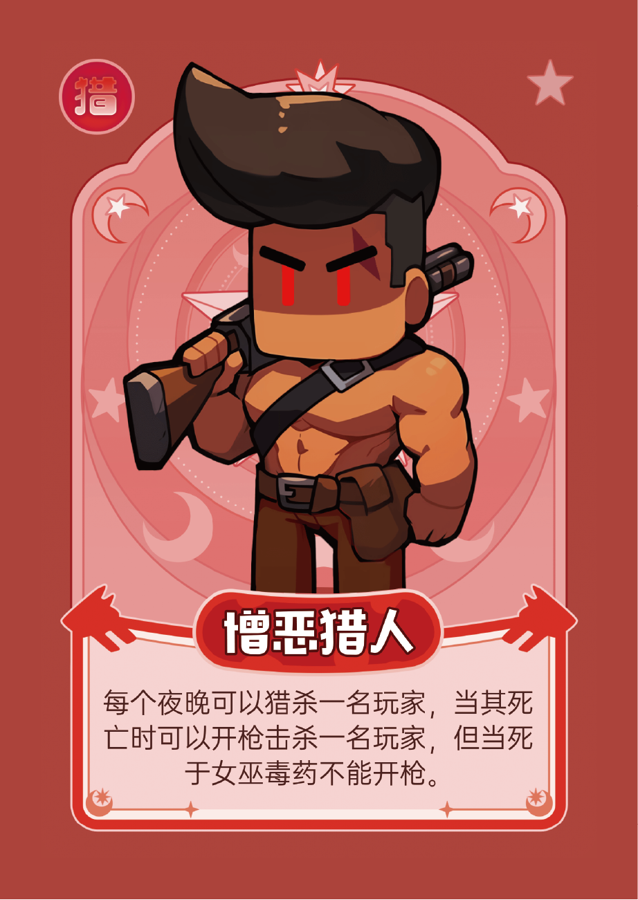 技能:每个夜晚可以猎杀一名玩家,当猎人死亡时, 可以开枪击杀一名玩家,但当死于女巫毒药时,不能开枪。