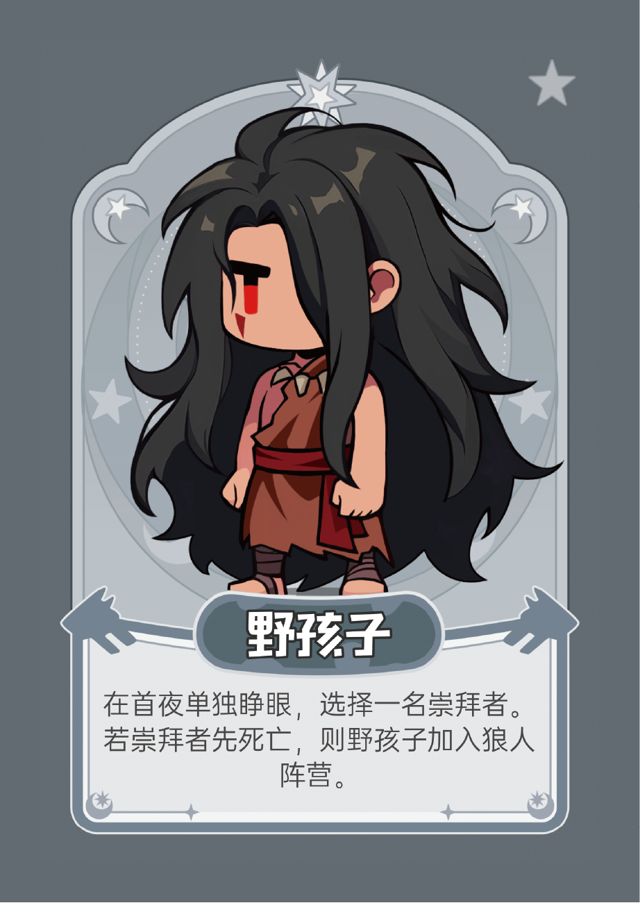 技能:在第一晚野孩子单独睁眼,选择一名崇拜者。当崇拜者出局后野孩子会在下个白天或者夜晚加入狼人阵营,随后每晚参与杀人。野孩子变成狼人后,将加入狼群,与狼人互知身份,夜晚与狼人一起睁眼杀人。