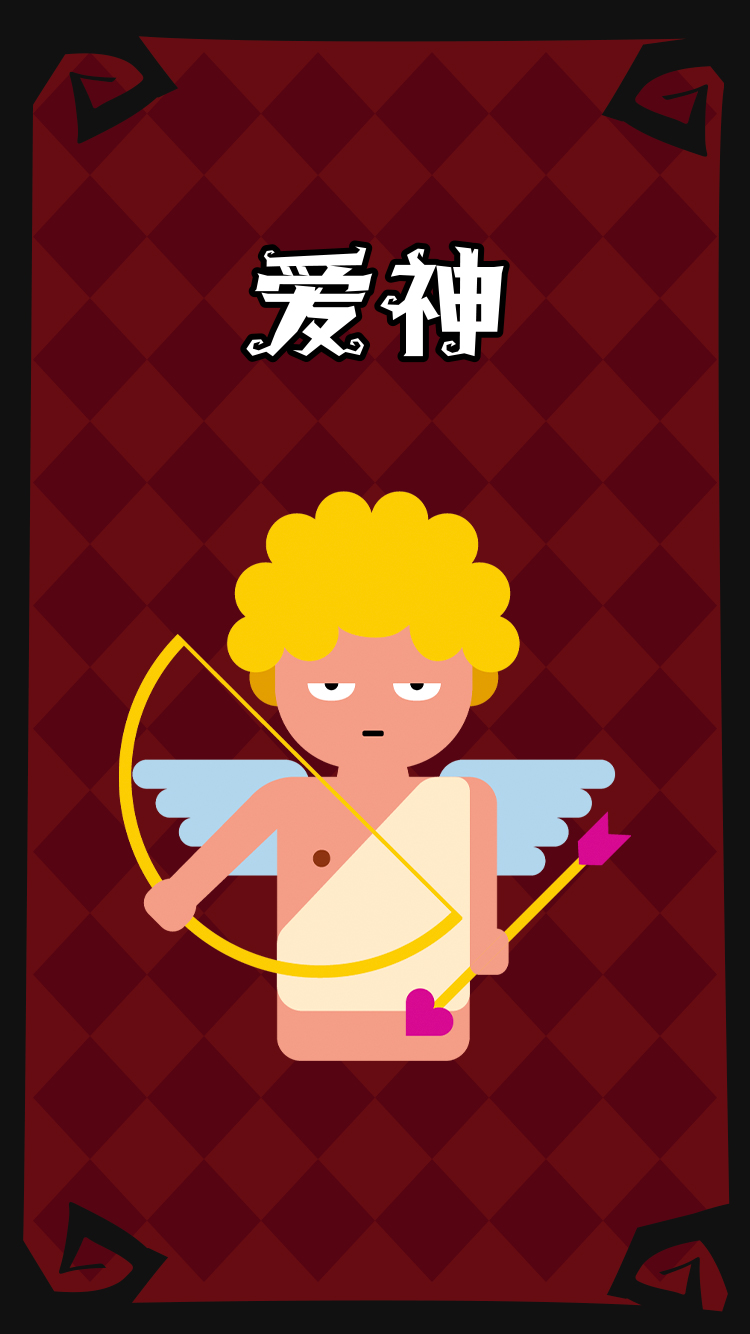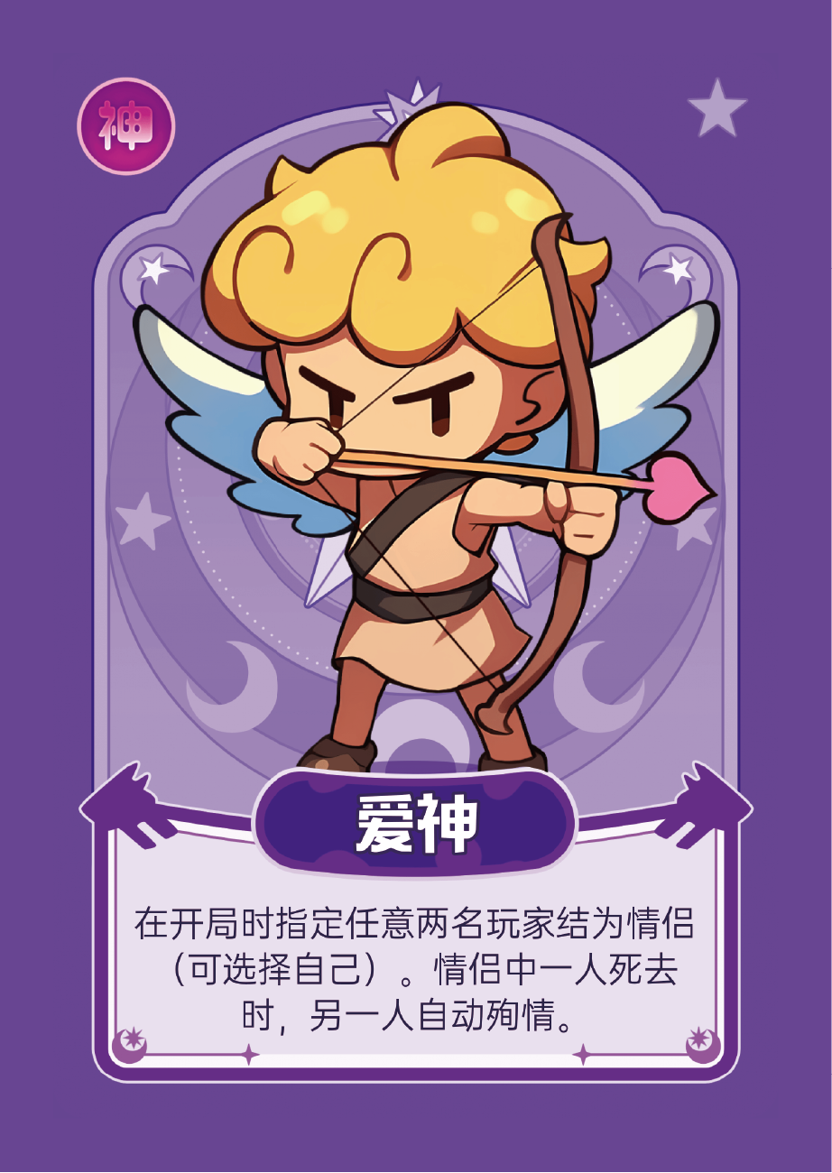 技能:在开局时指定任意两名玩家(可以包括自己)成为情侣,情侣中有一人死去时,另一人将自行殉情。
