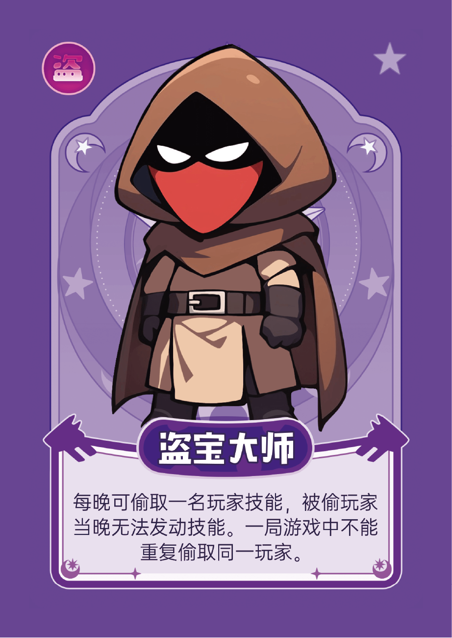 技能:每晚可偷取一名玩家技能,被偷玩家当晚无法发动技能。一局游戏中不能重复偷取同一玩家。